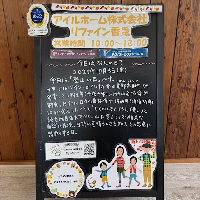 日付は日本山岳協会1905年(明治38年)10月に発足したことと「と(10)ざん(3)」(登山)と読む語呂合わせから。