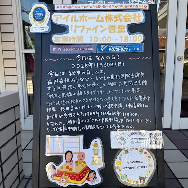 日付は近代絵本のさきがけとなる考え方を示した児童文学作家・瀬田 貞二(せた ていじ 1916-1979年)の『絵本論』(福音館)の初版が発行された1985年(昭和60年)11月30日にちなんで。