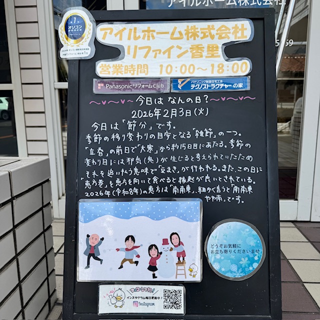 また、この日に「恵方巻」を恵方を向いて食べると縁起が良いとされている。