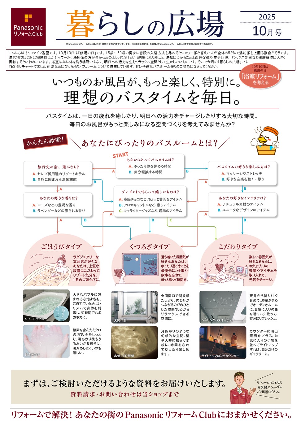 浴室は単に体を洗う場所ではなく、明日への活力を生むリラックス空間として生かしたいものです。そこで今月の「暮らしの広場」ではYES・NOチャートで楽しめる「あなたにぴったりのバスルームについて特集しています。
